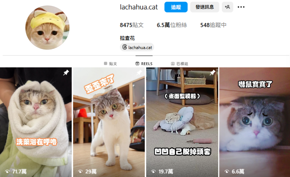飼主康康將家中四隻貓的日常生活轉化為插畫與 Reels,建立了一個具 IP 潛力的「寵物宇宙」。帳號還推出貼圖與漫畫,開展多元變現模式。