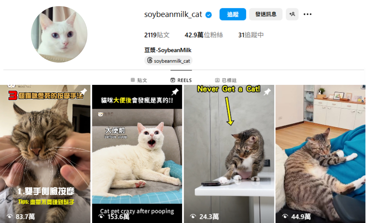 豆漿是一隻外表優雅、氣質高冷的藍眼白貓,其實曾是街頭流浪貓。這樣的「逆轉故事」本身就具備敘事性與情感張力,再加上飼主阿皓擅長用 Reels 呈現貓咪優雅瞬間,形成高質感的療癒風格。