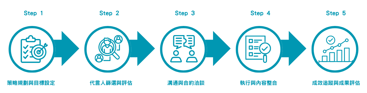 在理解品牌代言的五大核心價值後,品牌必須掌握的下一步是「如何落實」。一場成功的代言合作,絕非僅是找一位紅人拍廣告這麼簡單,而是從策略規劃到內容落地,需經過縝密的流程控管與跨部門協作。以下將從品牌端的實務操作角度,公開代言合作的五大步驟,協助行銷人員系統化地規劃每一次合作案。